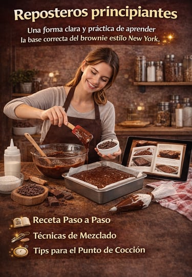 BROWNIE ESTILO NEW YORK PARA VENDER es una guía práctica que te acompaña paso a paso para lograr un brownie alto, húmedo y con costra perfecta, incluso si estás empezando.