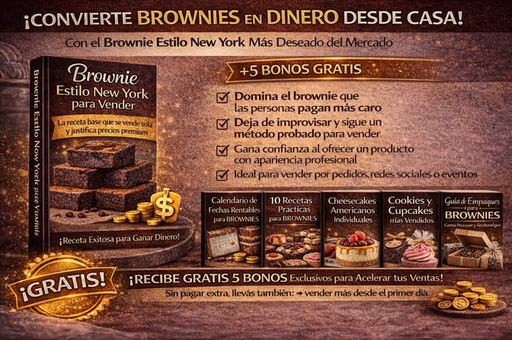 Es un material educativo exclusivo que te enseña paso a paso cómo preparar el auténtico brownie estilo New York: alto, húmedo y con costra perfecta, con un método claro y probado, diseñado para ayudarte a producir, vender y generar ingresos con brownies irresistibles.